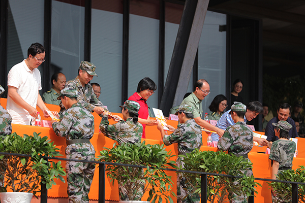 胡钟华代表学校向为本次军训付出辛勤努力的帮训部队表示衷心感谢。他指出,经过十天的军训,同学们已初步形成了团结互助的和谐氛围,培养了服从命令、听从指挥的良好作风,树立了顽强拼博、永争第一的进取精神,增强了集体荣誉感和爱国爱校的宝贵品质。军训为大家拉开了大学生活的序幕,训练是短暂的,但影响却是深远的。最后,他希望同学们在学习生活中,继续保持军人作风、培养集体观念、塑造高尚人格,以饱满的精神和不服输的志气投入到学习和艺术创作中去;希望同学们胸怀远志,践行“行健、居敬、会通、履远”校训精神,做有行动、有情怀、有学术、有志向的一代国美青年,共塑国美家园精神内涵;希望同学们珍惜青春,脚踏实地,读书养心,劳作上手,在实践中成长、在磨炼中进步,在服务国家和社会发展的过程中尽情展露自己的才华。