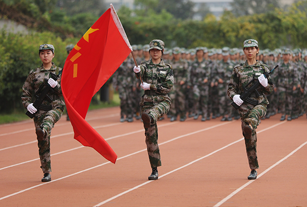 上午9点整,大会在庄严的国歌声中拉开序幕。踏着激昂的进行曲,全体新生身着戎装、昂首列队,向全校师生展示了他们刻苦训练的成果。分列式表演在铿锵的解放军进行曲中进行,各方阵军姿齐整,迈着矫健的步伐通过主席台,接受校领导和部队首长的检阅。随后,分别展开对敌战术、女子防身术、军体拳等汇报表演,女生英姿飒爽,男生精神抖擞,汇报表演声势浩大,为军训画上了圆满的句号。