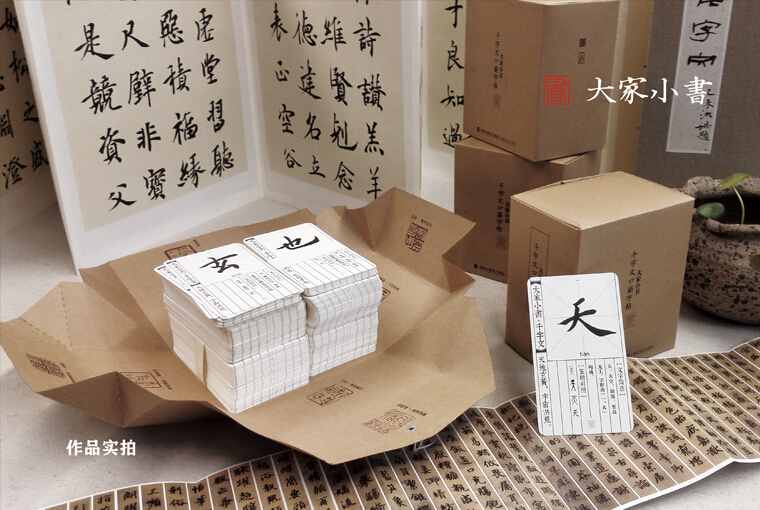 《大家小书·千字文》是以“书写经典”为基础的“大家小书”活化传统文化传播项目的阶段性成果,是一本打破边界,植根于中国传统经典、可读性强的公益文化普及类书籍。由书法系研究生书写团进行文字书写,陈昊月等30余名书法理论专业本科生进行编写工作。每张口袋字帖都是由“米字格书法识字及拼音”、“智永千字文原帖”、“文字简意”、“篆楷对照”和“千字文内容对照”共五个部分组成。外包装内侧有书法系研究生以千字文内容为作的篆刻作品。每一张字帖都可以让书法爱好者们了解字的释义及从古至今的字形变化,让中华传统文化之美得到更好地传播。