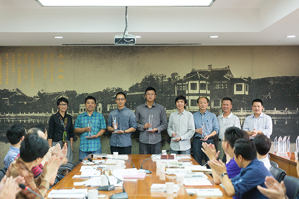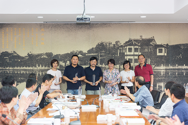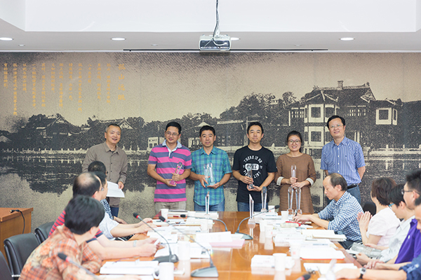 会上,党委班子成员还分别为“烽火艺程——中国美术学院师生纪念抗战胜利70周年歌会”优秀节目获奖的各部门各单位颁奖,影视与动画艺术学院《游击队之歌》、高职学院《救国军歌》、机关教工《歌唱祖国》获一等奖,女工委《二月里来》、老干部《在太行山上》、绘画艺术学院《长城谣》、手工艺术学院《光荣与梦想》、附中《黄水谣》获二等奖,建筑艺术学院《弹起我心爱的土琵琶》、艺术团《毛主席的话儿记心上》、上海设计学院《强军战歌》、雕塑与公共艺术学院《满江红》、新生二营《有我在》、设计艺术学院《在灿烂阳光下》、艺术管理与教育学院《没有共产党就没有新中国》、新生三营《大刀进行曲》获三等奖,中国画与书法艺术学院《地道战》、艺术人文学院《红星歌》、新生一营《假如战争今天爆发》、继续教育学院《中国人民解放军军歌》、新生四营《保卫黄河》、跨媒体艺术学院《团结就是力量》获优秀奖。